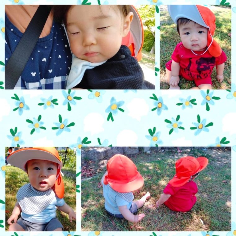また0歳児は芝生の上に座って