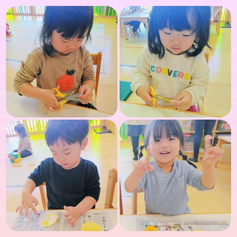 久しぶりに使うハサミにドキドキしていましたが、黄色と白の折り紙をとっても上手に切る事が出来ていましたよ✨