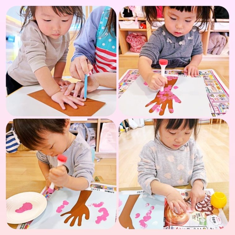 手を型どって作った木の幹にピンクと白の絵の具スタンプをしてとっても綺麗なさくらの木を作っていました🥰