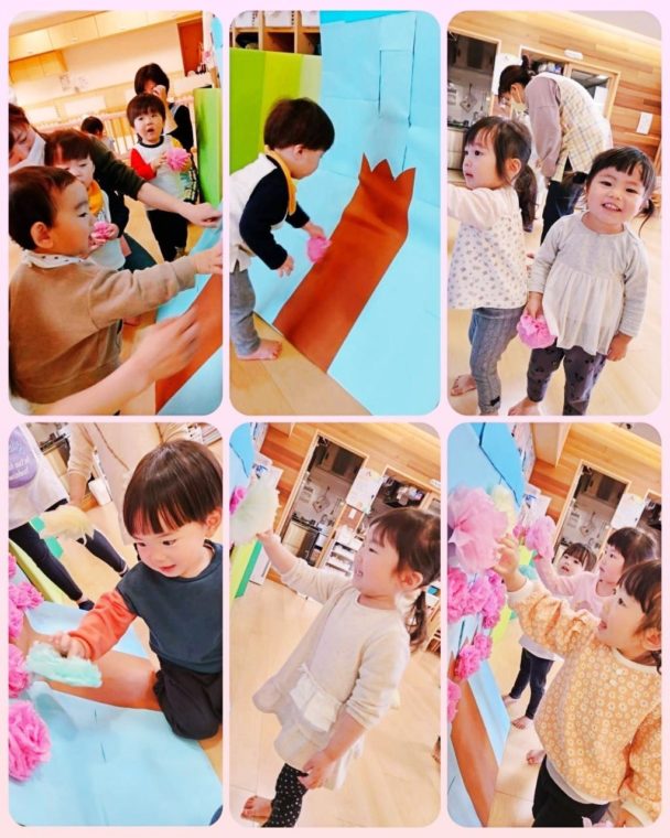 ひよこ🐤組さんから順番に色んな色の花紙をペタペタと貼っていきました!少しずつ完成していく桜の木を見て「すごーい!」「綺麗だねー!」など子どもたちも喜んでいました🥰
