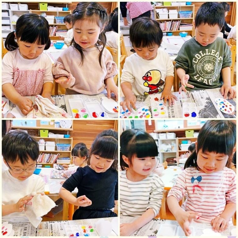 うさぎ組🐰さんは、クレヨンで”ちょうちょ”の模様を付けました!🖍自分たちで、好きな色のクレヨンを選んで、上手にお絵描きしていましたよ👏”つくし”には、綿棒スタンプに絵の具を付けて模様を描きました!