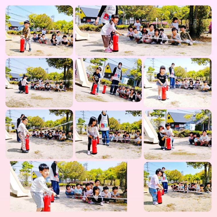 うさぎ組・ぱんだ組はお部屋の中で実際に消火器を触りました😊