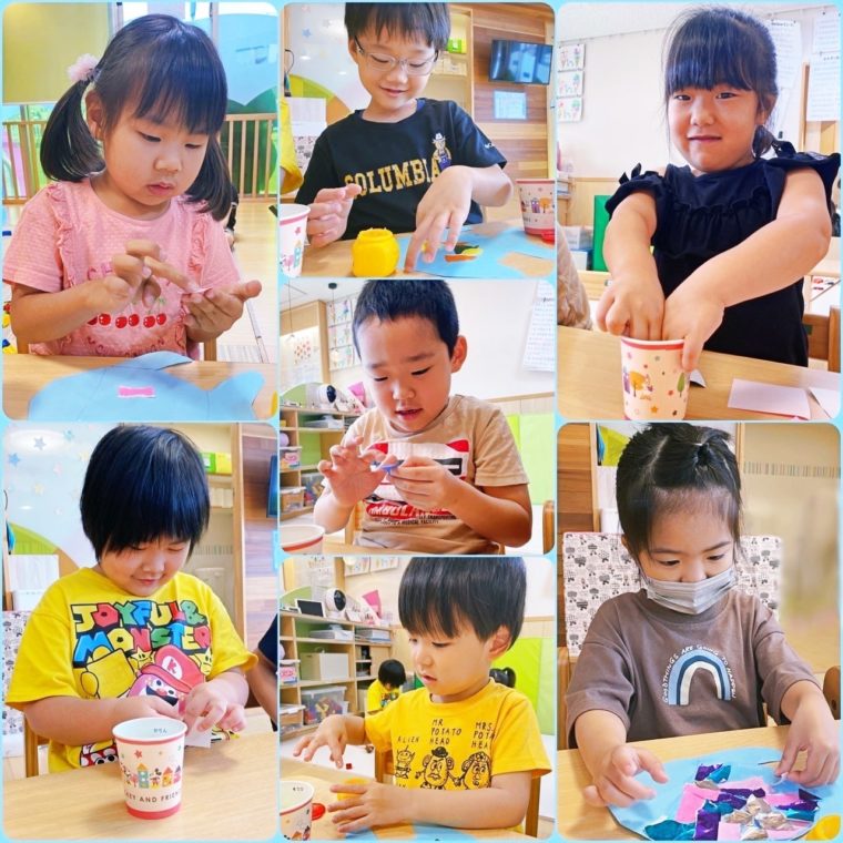 好きなキラキラ折り紙を選んでちぎり絵をしたり、好きなところにのりで貼ったりして、個性溢れるお魚が完成しましたよ🥰