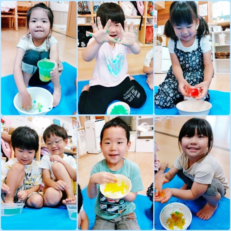 「なにこれ!」「ぷにぷにしてる」と最初は不思議そうにしていた子どもたちも、いざ触ってみるとすぐに慣れ、勢いよく潰してみたり、違う色と混ぜたりして、楽しむ姿がありました😆