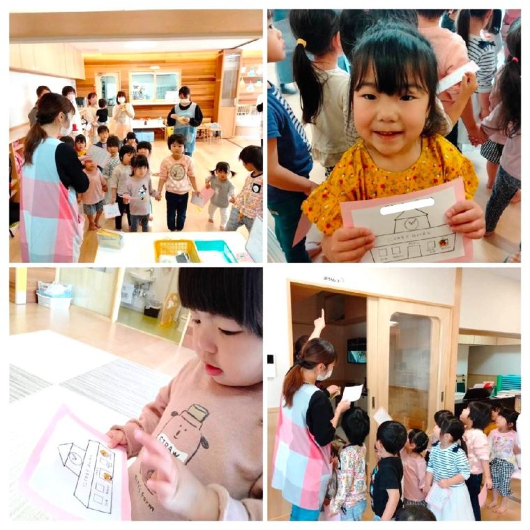 保育園の絵が書いてあるカードをひとり一枚持ち、各お部屋を探検した後にシールを集めていきました!