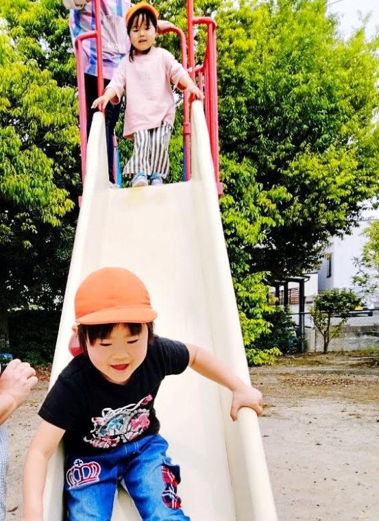 公園では滑り台やしっぽ取りゲームをして身体を動かしました。先生たちからしっぽを取られないように一生懸命逃げました😆