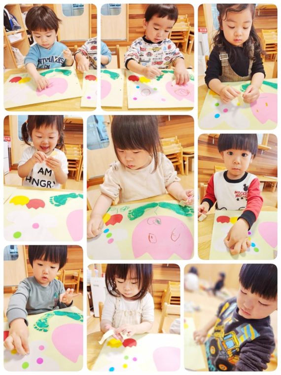 ぱんだ組🐼さんは、シールで”ちょうちょ”に可愛い模様を付けたり、クレヨン🖍で“チュウリップ“にお顔を描いたりしましたよ🌷.*