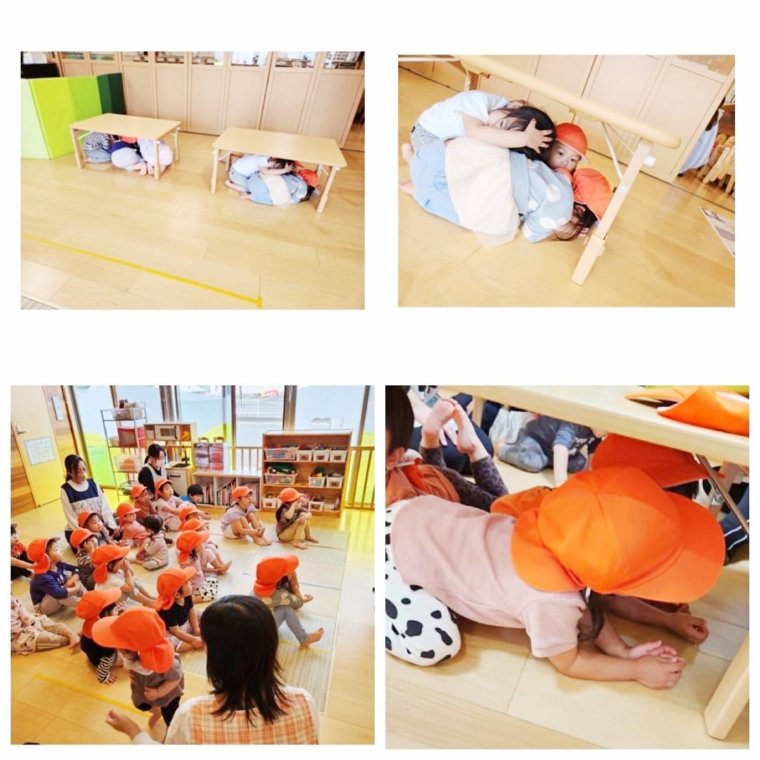 保育士の話を聞き机の下や安全な場所に避難し、頭を守ることができました‼️