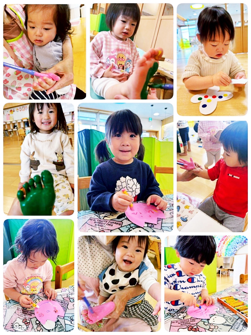 足の裏や手のひらにピンクの絵の具を塗って足型、手型🖐️をペッタンととって可愛らしい桜🌸の木を作りました。