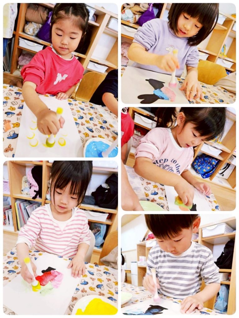 いろんな色を使って綺麗に模様をつける子ども達『見てみてー綺麗な色になったよ💛』とお友だちや先生に見せていましたよ!