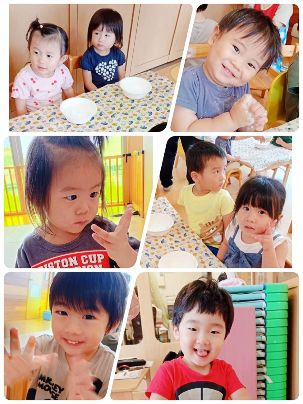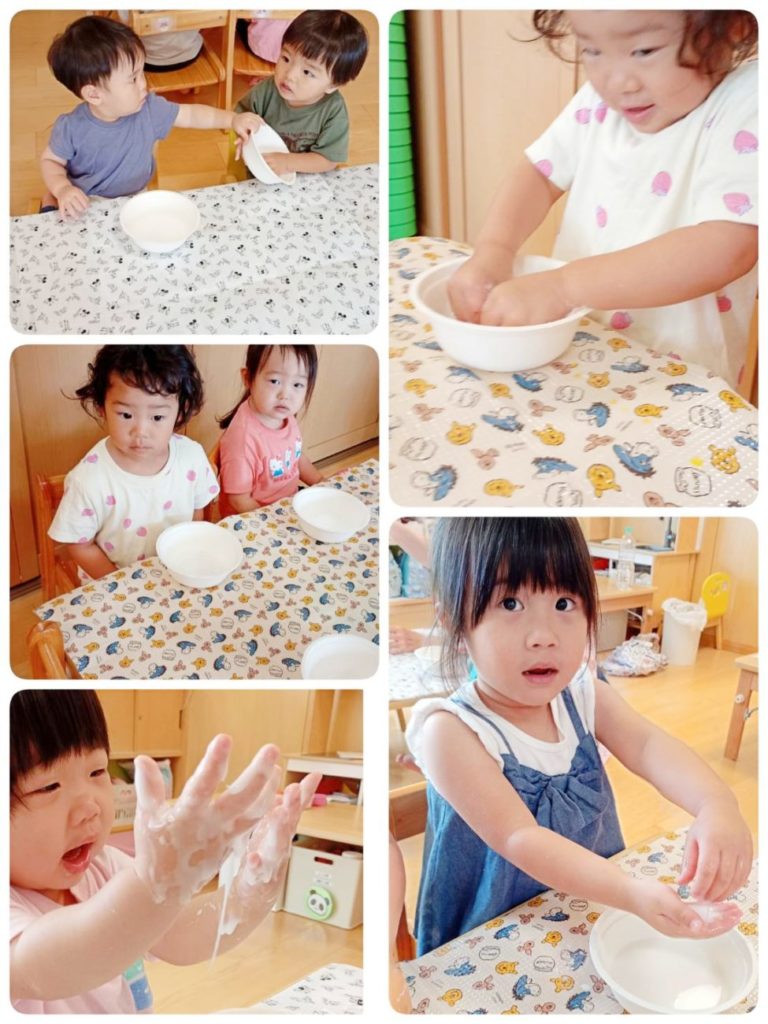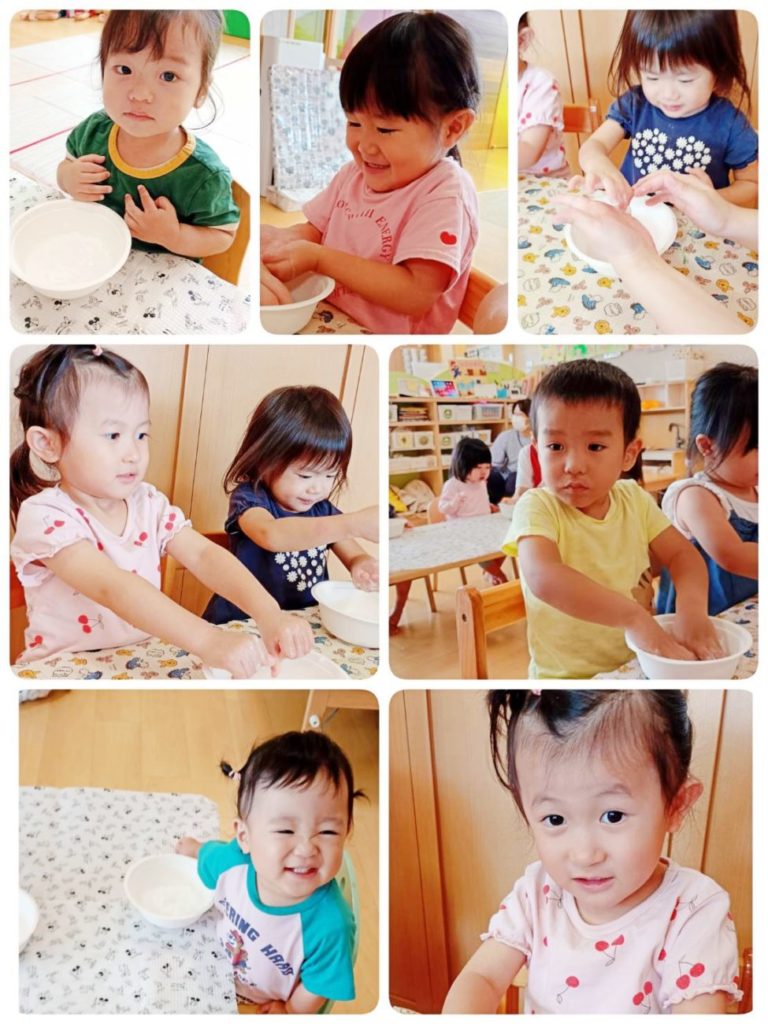⚪片栗粉で手が白くなってびっくり👀‼️している子と、色々な表情をみせてくれました。