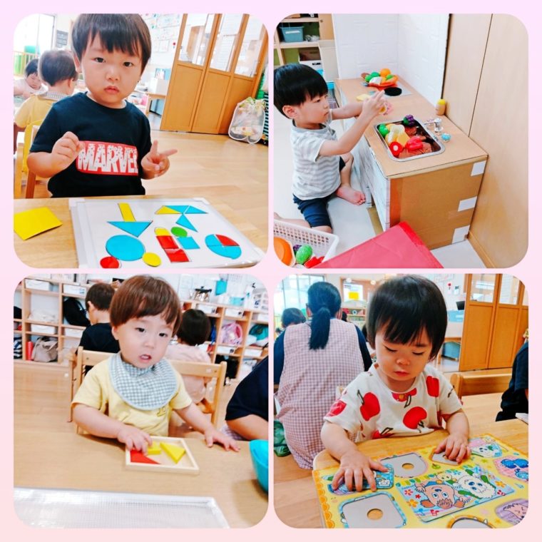 きりん🦒組、ぞう🐘組がスポーツ教室行ってる間、くま🐻組、ぱんだ🐼組、うさぎ🐇組は、知育遊びをしました。 みんなどれにしよう?と考えて、パズルや型はめ、ままごと... -