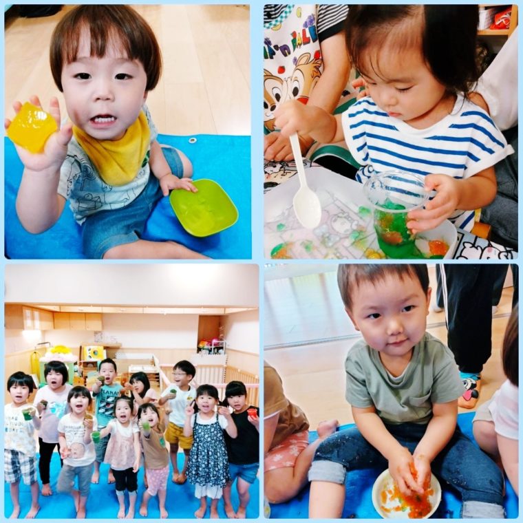 雨の日はお外での水遊びが出来なかったので、部屋の中で寒天遊びをしましたよ✨ 「なにこれ!」「ぷにぷにしてる」と最初は不思議そうにしていた子どもたちも、いざ触っ... -