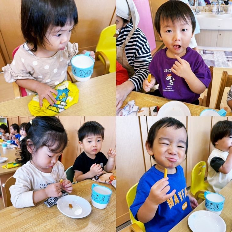 この日のおやつはスティックのおやつでした⭐ 未満児さんも「いただきます」のご挨拶が 上手にできるようになりましたよ♪ お友達ともお話ししながら 先生に「これ美味し... -