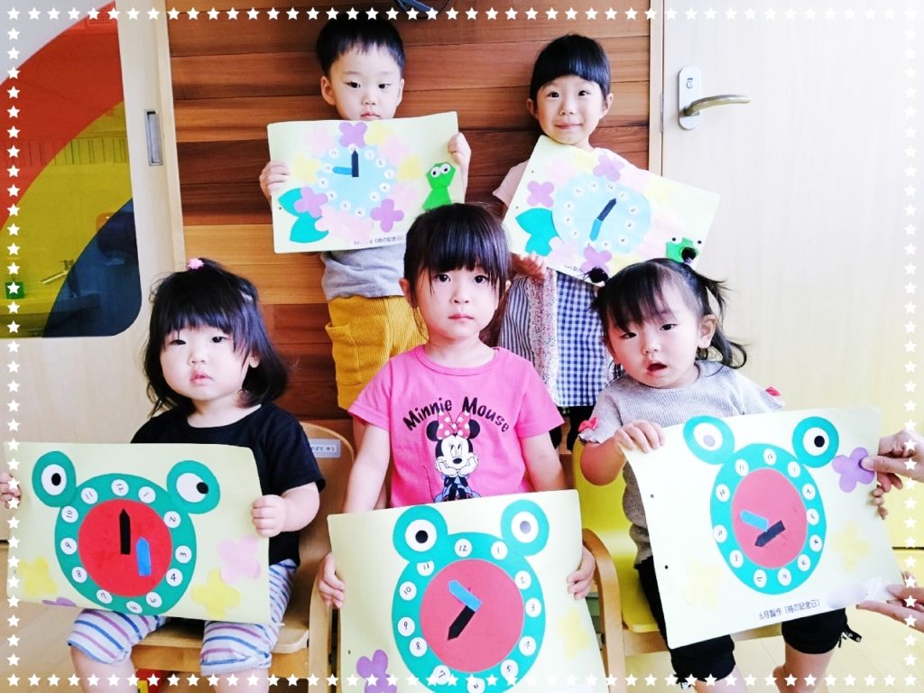 6月の製作は6月10日が時の記念日なので、時計の製作をしましたよ😊🕰 以上児さんはいろいろな色のあじさいが可愛らしい時計を作りました🥰 本物の時計を見ながら「1はど...