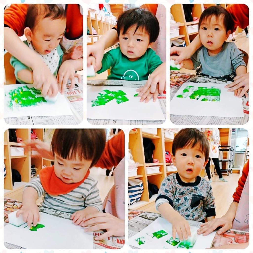 12月の製作をしました🎄 クリスマスにちなんでクリスマスツリーを作りましたよ! 0歳児🐤は紙の上に絵の具を乗せてビニール袋の中に入れ、色を伸ばし感触遊びをしました... -