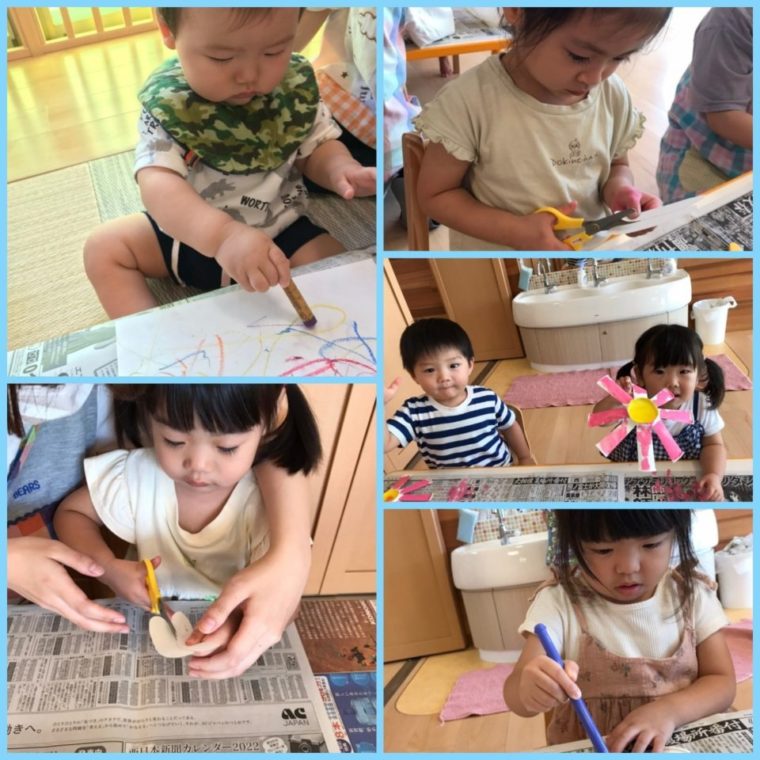 みんなも楽しみにしてる製作🌟 今月は「とんぼとコスモス」を作りました😊❗️ ひよこ組🐣は足形とクレパスでとんぼを、うさぎ🐰・ぱんだ🐼組は筆とハサミを 使って、と... -