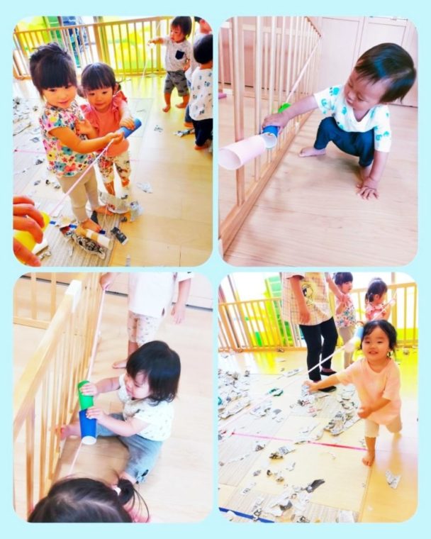 ひよこ🐥・ぱんだ🐼・うさぎ組🐰のお友だちは新聞紙遊びをしました! 大きな新聞紙を細く小さくちぎったり、もっと小さく小さく丸めたり指先を沢山使って楽しんでいまし... -